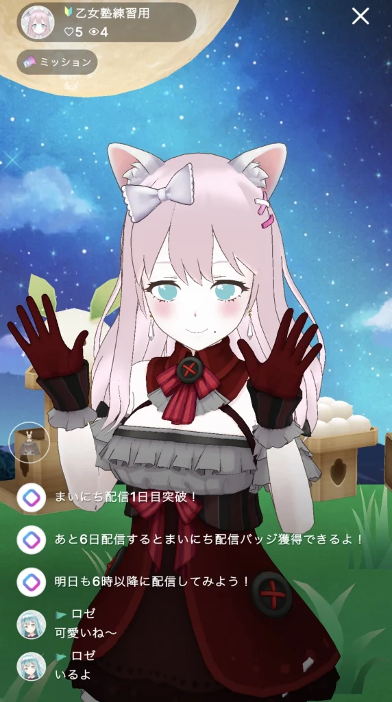REALITYの乙女塾デモアカウントを使用し、講師と一緒に仮想空間での配信を体験します。