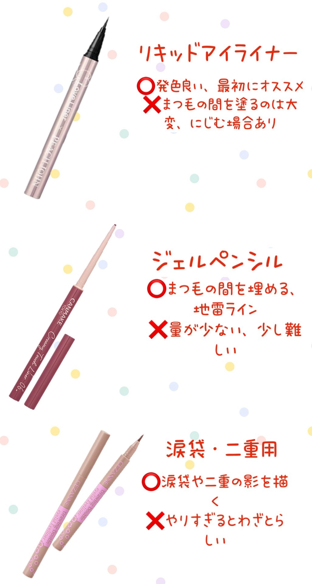 まずはジェルペンシル、リキッドアイライナー、二重・涙袋用この3種類さえ覚えればOKです!
