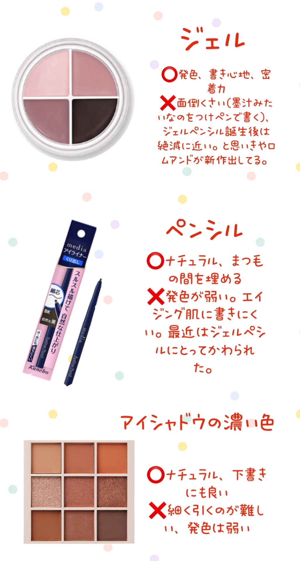 柔らかくて描きやすく、色が豊富で下まぶたのメイクやまつ毛の間を埋めるなど多彩な使い方ができます。ただ、繰り出し式が多く、一回出すと引っ込められない、容量が少なく使い切るのが早いといった部分がデメリットでしょうか。