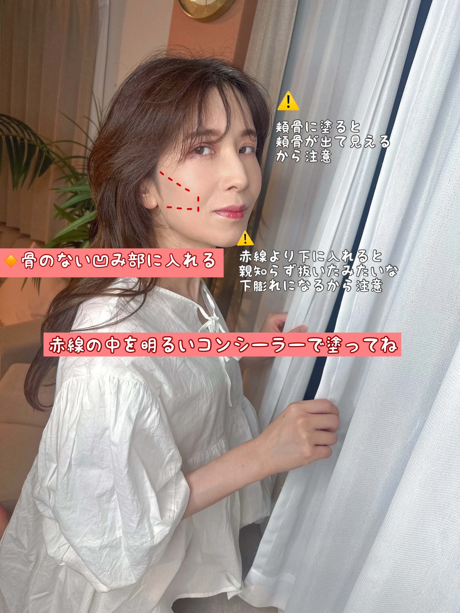 明るい箇所にコンシーラーを塗ります。 「何故、ふっくらするのか」 理由は簡単で、色は明るい方が前に出て膨張して見えます。つまり、「ファンデーションを塗った状態の肌よりも少し明るめのコンシーラーを赤線枠内に塗る」とそこにハイライト効果が生まれ、「明るくふっくら見える」んです。